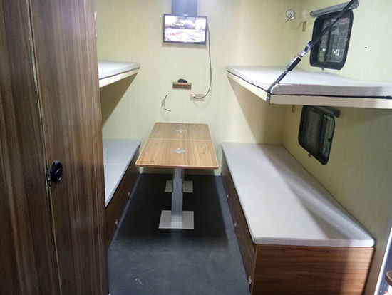 東風(fēng)大型四驅(qū)越野房車(chē)滿(mǎn)足更多路況復(fù)雜環(huán)境使用,廂體內(nèi)裝有豪華折疊床、液晶電視、儲(chǔ)物柜、應(yīng)急燈、頂燈、頂置空調(diào)、床墊、被褥、燃油加熱器、頂護(hù)欄、爬梯、隱藏抽拉梯、專(zhuān)用房車(chē)門(mén)、中空玻璃、戶(hù)外燈。由保溫廂體、空氣調(diào)節(jié)系統(tǒng)、宿營(yíng)設(shè)施、影音系統(tǒng)、電氣系統(tǒng)、通風(fēng)換氣系統(tǒng)、洗漱和衛(wèi)生設(shè)施。整個(gè)廂體分為三個(gè)部分,住宿區(qū)、洗漱區(qū)、餐飲區(qū)。住宿區(qū)包括四個(gè)上下鋪,床頭燈,液晶電視,空調(diào)等。洗浴區(qū)包括臉臺(tái),衛(wèi)生間,熱水器等。餐飲區(qū)包括無(wú)煙灶臺(tái),可活動(dòng)餐桌,洗菜盆等。也可以根據(jù)用戶(hù)的需要設(shè)計(jì),可增加會(huì)議室,辦公區(qū)等。東風(fēng)大型四驅(qū)越野房車(chē)內(nèi)飾圖片:
