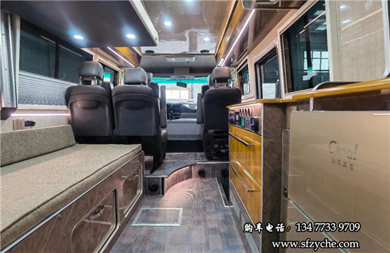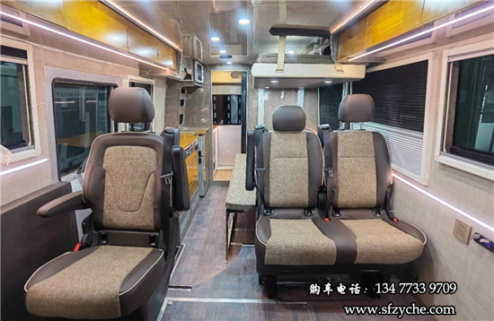 得益于方正的車身,車內(nèi)空間非常寬敞,內(nèi)寬可達2米。布局方面從前往后依次是駕駛區(qū)、乘坐區(qū)、生活區(qū)和尾部的廚衛(wèi)區(qū)域。整車核載5人,車廂中部采用2+1座椅布局,全部帶有扶手和頭枕,乘客座椅全部朝前設(shè)計,增加了乘坐的舒適度。