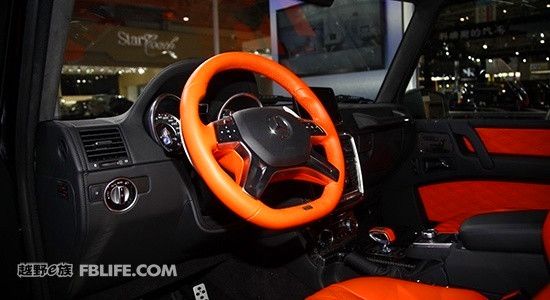 北京車展上的基于G63 AMG 6×6改裝而來(lái)的BRABUS 版700G 6 X 6 內(nèi)飾方面,該車采用了黑色和橘黃色的顏色搭配,強(qiáng)烈的顏色反差構(gòu)造出不錯(cuò)的視覺(jué)效果。四幅式真皮方向盤(pán)外圈也采用橘黃色真皮包裹,搭配顏色裝飾條,視覺(jué)效果極佳。擋把的設(shè)計(jì)類似于飛機(jī)操作感,上面印有巴博斯的標(biāo)志,非常具有設(shè)計(jì)感。
