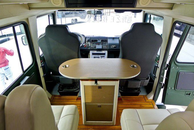 越野房車內(nèi)飾:可以看到,柚木地板外加兩個電動座椅與一個帶儲藏柜的可移動多功能桌構(gòu)成了這輛越野房車的第二排。除此之外,頭頂上方安置有26寸索尼液晶電視和帶衛(wèi)星電視機(jī)頂盒的藍(lán)光播放器,微波爐烤箱、小型冰箱、電磁爐等常用設(shè)備也是一應(yīng)俱全,當(dāng)然恒溫式的出水系統(tǒng)以及真空馬桶、獨(dú)立淋浴也是一樣不少。具備天窗和側(cè)窗的尾箱處安置有兩張舒適的標(biāo)準(zhǔn)床鋪,可以說盡管這輛U5000并非加長特裝版,但所有居住設(shè)備都很齊全。
