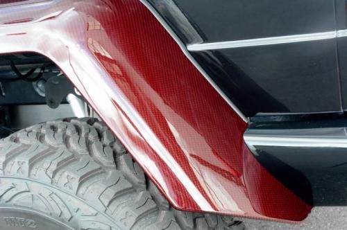 第一眼看去,這輛G63 AMG 6x6的涂裝會(huì)讓人感覺有些怪異。的確,這輛Brabus出品的六輪怪獸換上了紅色碳纖維車身改裝件,后視鏡蓋、輪眉以及引擎蓋都采用了紅色碳纖維材料。透過車窗我們能看到內(nèi)飾同樣是紅色主題,甚至是輪圈內(nèi)也有紅色點(diǎn)綴。