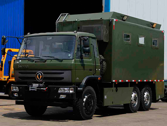 東風(fēng)六驅(qū)國(guó)五越野廂式車簡(jiǎn)介:采用東風(fēng)原廠六驅(qū)國(guó)五越野底盤EQ2220GD5DJ型,駕駛室為老款153,新款D913兩種可以選擇,康機(jī)190馬力帶增壓,機(jī)械式六檔變速箱,3.5噸軍檢分動(dòng)箱,4.5噸雙聯(lián)式軍用驅(qū)動(dòng)前橋,5噸軍用貫通式雙后橋,方向助力,離合助力,前橋介入高低檔均采用電控式,315/80R22.5越野輪胎,軸距3500+1250mm,ABS,隨車工具及備胎各一套。